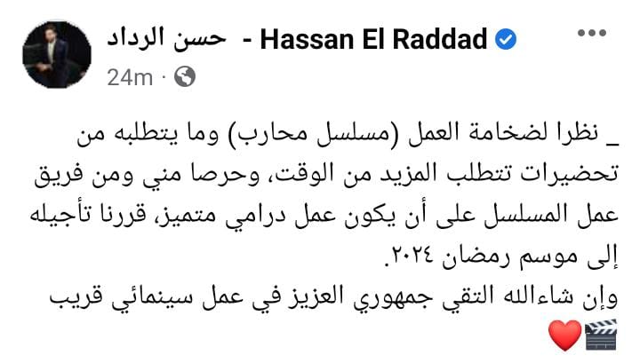 أعلن الفنان حسن الرداد عن تأجيل مسلسله الدرامي، الذي كان من المقرر عرضه ضمن سباق رمضان 2023، وذلك بشكل مفاجئ للجمهور.