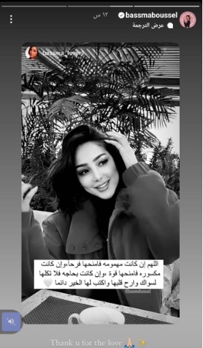 وظهرت عبر خاصية “ستوري”، بموقع بسمة بوسيل الرسمي بانستجرام، عدد من رسائل الموساه، كانت من بينها دعاء إحدى صديقتها لها، قالت فيه: اللهم ان كانت مهمومة فامنحها فرحا، وغن كانت مكسورة فامنحها قورة، وإن كانت بحاجة فلا تكلها أسواك.. وارح قلبها وامت لها الخير دائما"، وعدد أخر من الأدعية من قبل أصدقائها التي تحمل نفس المعنى.
