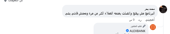 ومن جانبه، قال أحد عملاء بنك الاسكندرية في تعليق عبر صفحة المصرف الرسمية على موقع "فيسبوك"،: "البرنامج مش بيفتح واتصلت بخدمة العملاء أكثر من مرة ومحدش فادني بشئ".