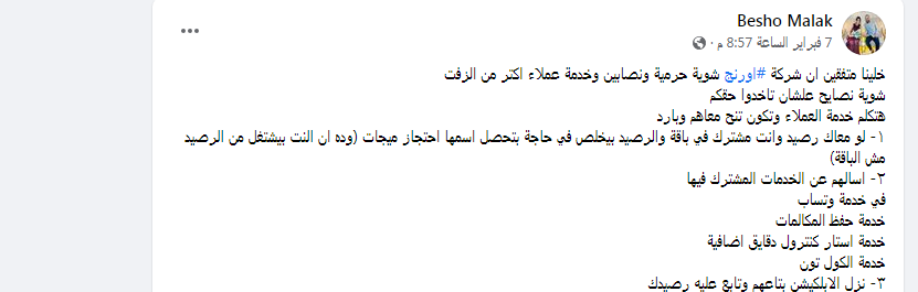وقال أحد عملاء اورنج orange في منشور عبر موقع "فيسبوك"،: "خلينا متفقين أن شركة اورنج شوية حرامية ونصابين وخدمة عملاء أكثر من الزفت".