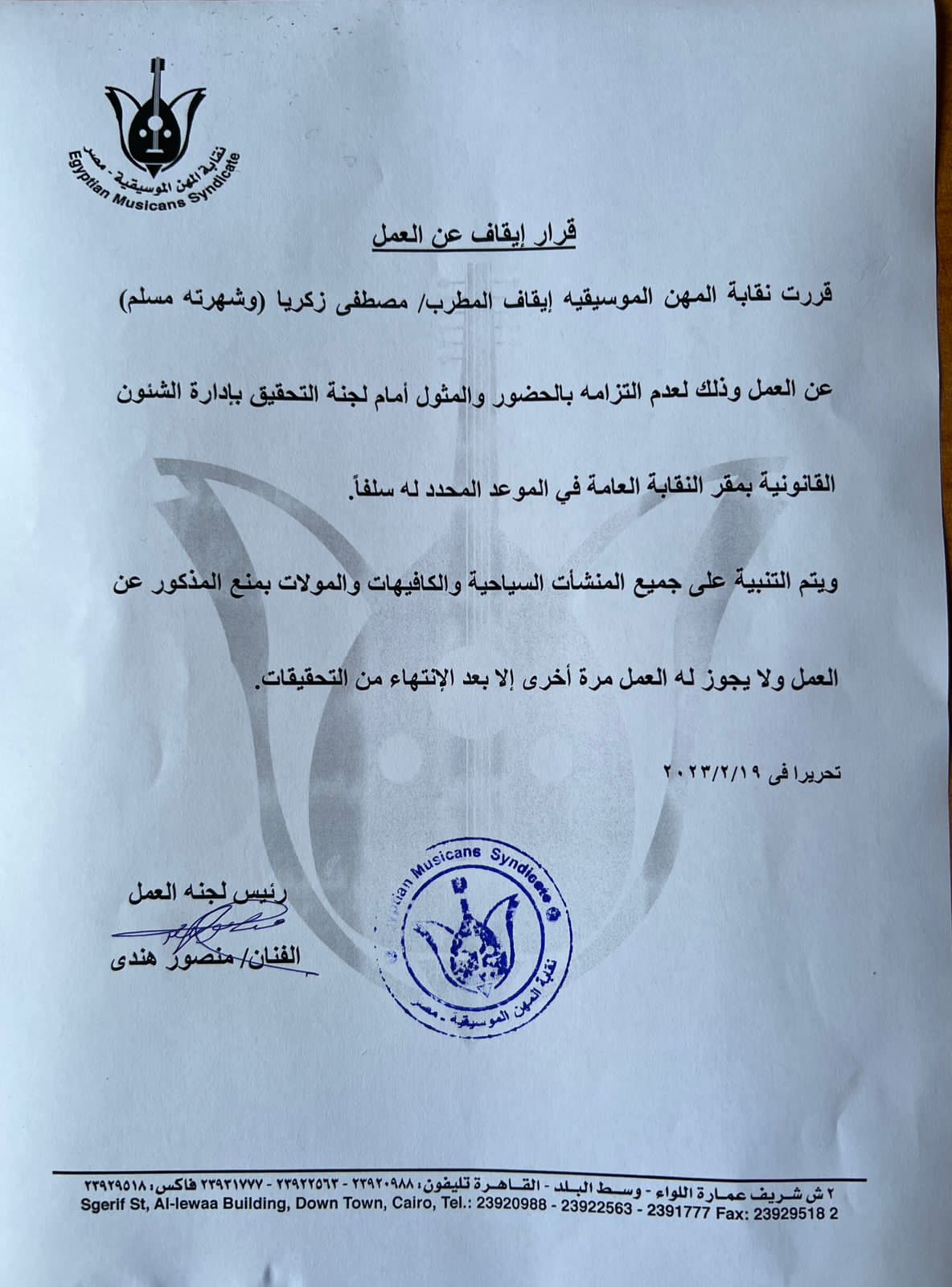 وتابع البيان: قررت إدارة الشئون القانونية بمعرفة السادة مستشارين النقابة الأستاذ علاء الدين عامر والأستاذ رامي عادل والأستاذ أحمد مكين، وبعد العرض على السادة أعضاء مجلس الإدارة الموافقة على إيقاف المطرب المذكور عن العمل لحين مثوله أمام إدارة الشئون القانونية بمقر النقابة العامة والانتهاء من التحقيقات.. وعليه تم تعميم القرار على جميع المنشآت السياحية والفنادق والمولات والكافيهات".