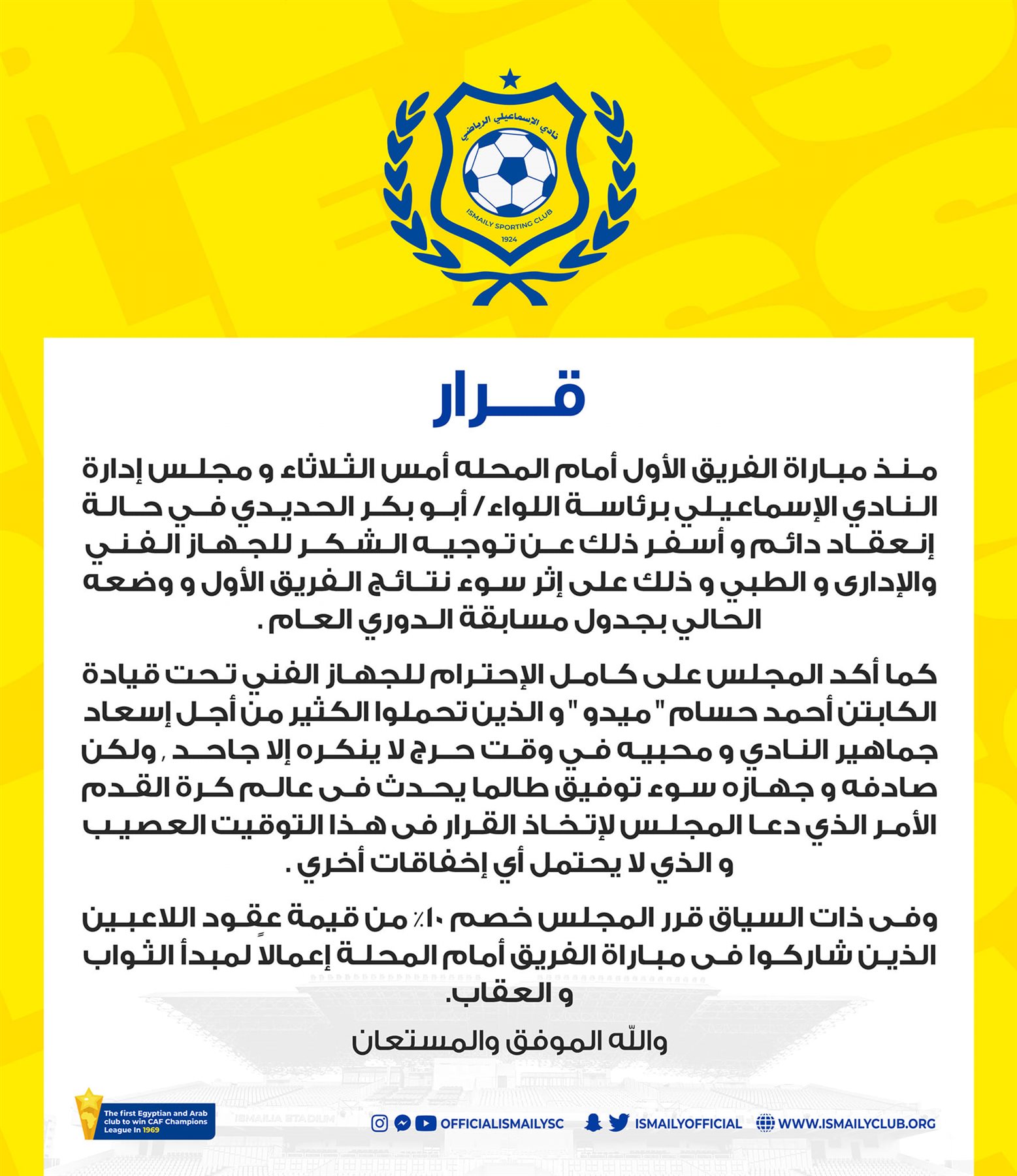 وأعلن نادي الإسماعيلي عبر موقعه الرسمي، توجيه الشكر لأحمد حسام ميدو وجهازه المعاون بعد الفترة التي قضاها مع فريق الدراويش، والتي خاض فيها 9 مواجهات حيث كانت بداية ميدو مواجهة الزمالك، وتلقى الاسماعيلي الهزيمة بثلاثية مقابل هدف واحد، ثم كانت المباراة الثانية أمام البنك الأهلي، وتعادل الفريقين بدون أهداف، ثم تلقى الإسماعيلي الهزيمة في مباراة حرس الحدود، بهدفين دون رد، وكانت الهزيمة بعد ذلك أمام المقاولون العرب على استاد الاسماعيلية، بثلاثية مقابل هدف واحد.