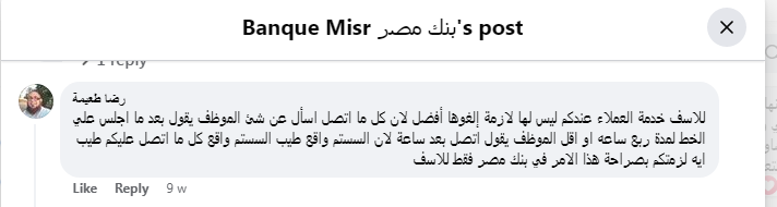 وقال أحد عملاء بنك مصر في تعليق عبر صفحة المصرف الرسمية على موقع "فيسبوك"،: "للأسف خدمة العملاء عندكم ليس لها لازمة إلغوها أفضل لان كل ما اتصل اسأل عن شئ الموظف يقول بعد ما اجلس علي الخط لمدة ربع ساعة أو أقل الموظف يقول اتصل بعد ساعة لأن السيستم واقع".