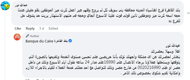 ورد موظف بنك القاهرة في رسالة اعتذار قائلاً: "بنعتذر لحضرتك عن اى مشكلة واجهتك نؤكد بأننا حريصين على تحسين مستوى الخدمة وتقديمها بالصورة التي يتوقعها ويستحقها عملاؤنا".