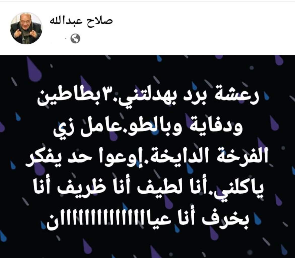 وكتب صلاح عبد الله عبر فيسبوك: رعشة برد بهدلتني،٣بطاطين ودفاية وبالطو عامل زي الفرخة الدايخة.