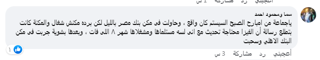 قال أحد عملاء بنك مصر في تعليق على موقع "فيسبوك"،: "ياجماعة من امبارح الصبح السيستم كان واقع ، وحاولت فى مكن بنك مصر بالليل لكن برده مكنش شغال".