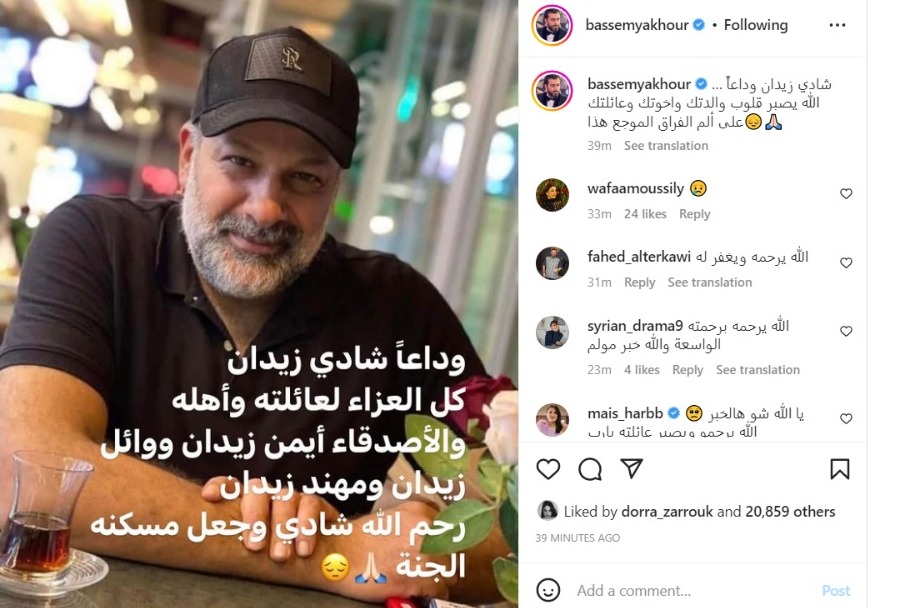 ونشر باسم ياخور صورة للراحل عبر انستجرام، معلقًا: شادي زيدان وداعاً.. الله يصبر قلوب والدتك واخوتك وعائلتك على ألم الفراق الموجع هذا.