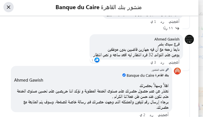 قال أحد عملاء بنك القاهرة في تعليق عبر صفحة المصرف الرسمية على موقع "فيسبوك"،: "فرع سيدى بشر، دايما زحمة مع أن فيه جهازين فاضيين بدون موظفين".