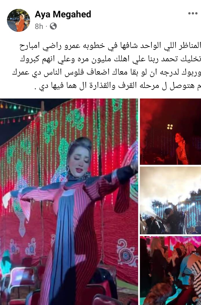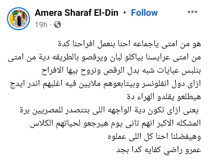 وكتب الأخر: ."من امتى ياجماعه احنا بنعمل افراحنا كدة من امتى عرايسنا بياكلو لبان ويرقصو بالطريقه دية من امتى بنلبس عبايات شبه بدل الرقص ونروح بيها الافراح ازاى دول انفلونسر وبيتابعوهم ملايين فيه اغلبهم اندر ايدج هيطلعو يقلدو الهراء دة يعنى ازاى تكون دية الواجهه اللى بتتصدر للمصريين برة المشكله الاكبر انهم تانى يوم هيرجعو لحياتهم الكلاس وهيفضلنا احنا كل اللى عملوه عمرو راضي كفايه كدا بجد".