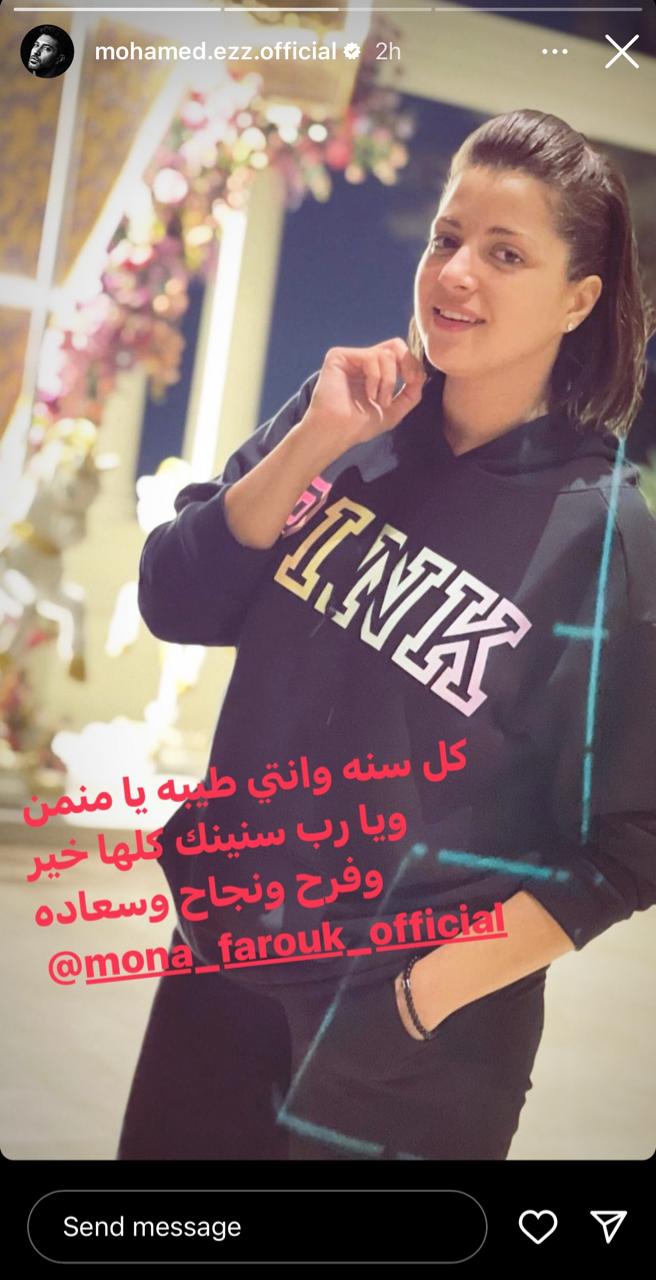 ونشر محمد عز صورة للفنانة عبر خاصية ستوري بحسابه الرسمي بانستجرام، معلقة: كل سنة وأنتي طيبة يا منمن ويا رب سنينك كلها خير وفرح ونجاح وسعادة.