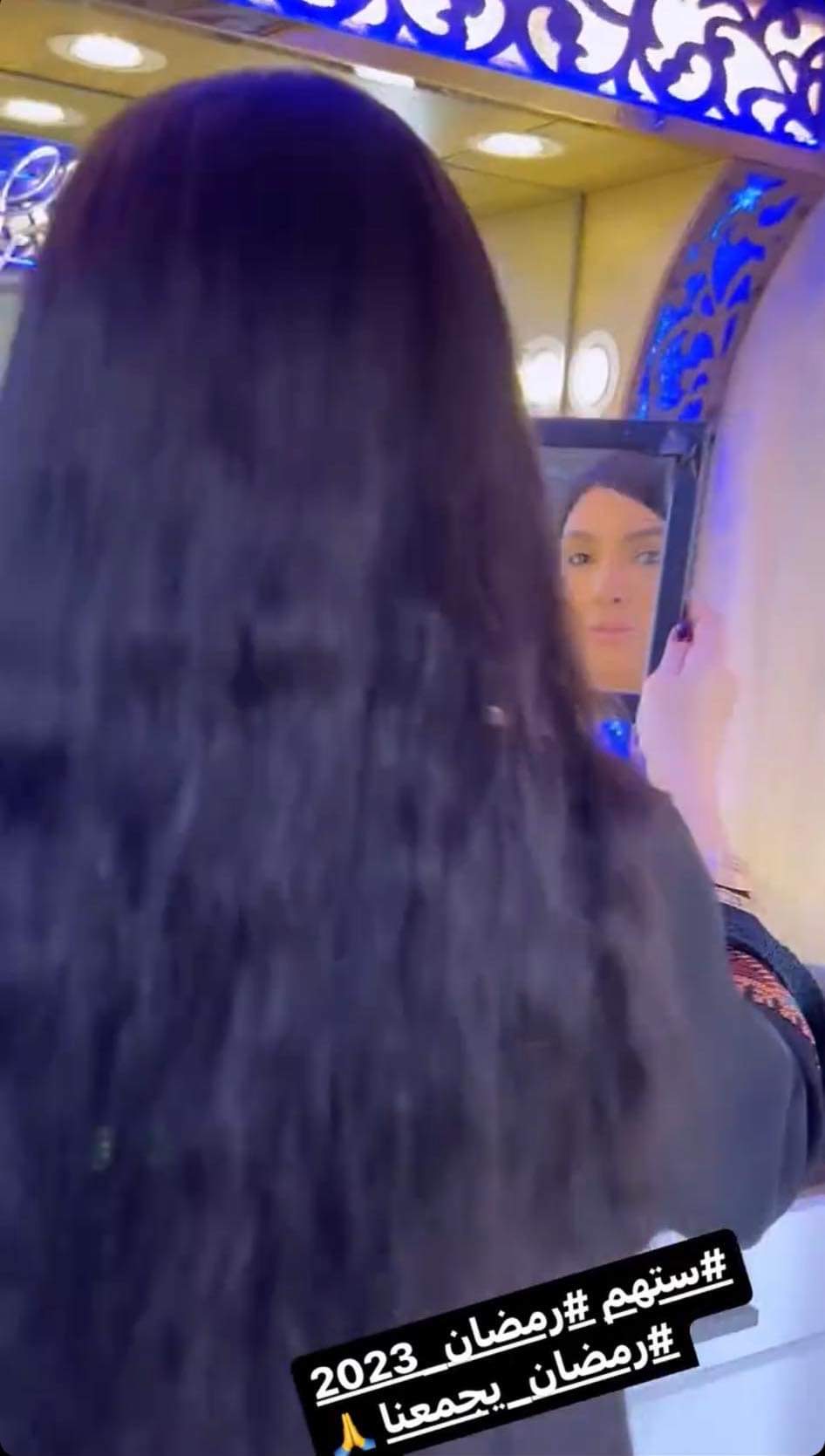 وظهرت روجينا بظهرها من التجهيزات بشعر اسود طويل منسدل، وكانت ممسكة مرآة ظهر فيها جزء من وجهها بالمكياج الخاص بالشخصية.