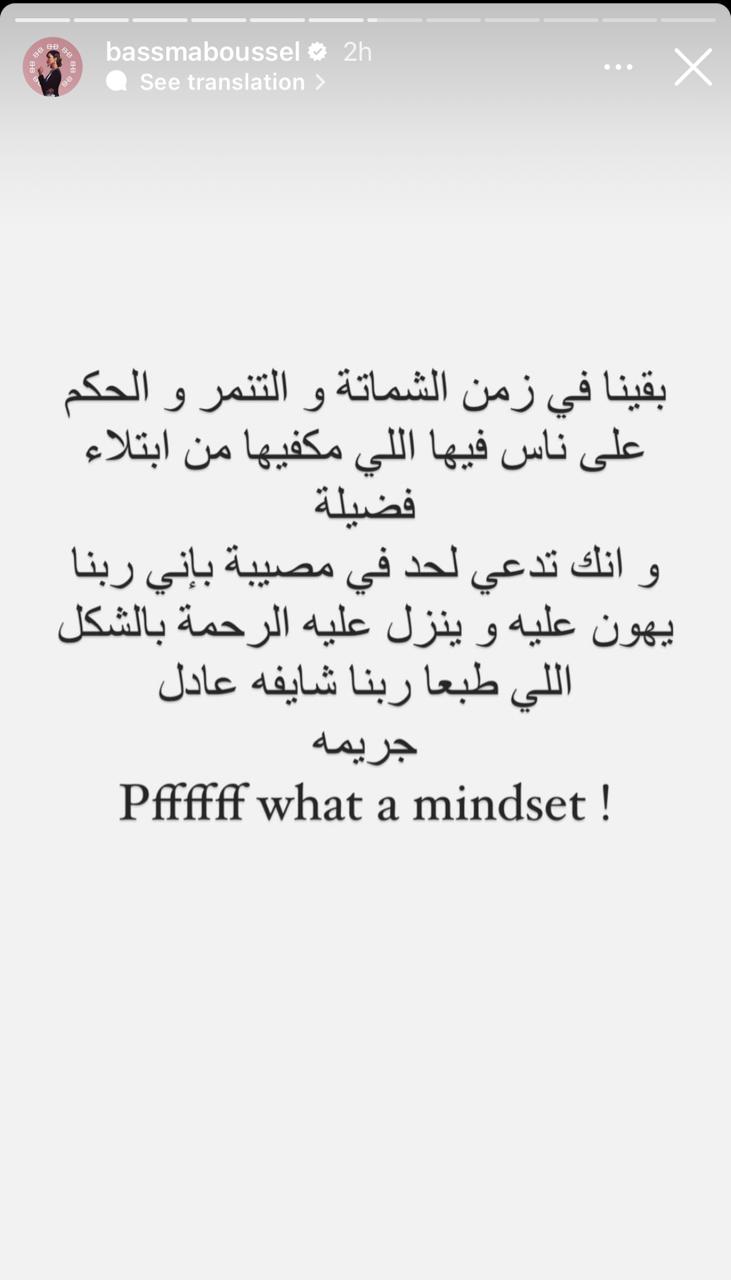 وكتبت بسمة عبر خاصية ستوري بانستجرام: بقينا في زمن الشماتة والتنمر والحكم على ناس فيها اللي مكفيها من ابتلاء فضيلة.