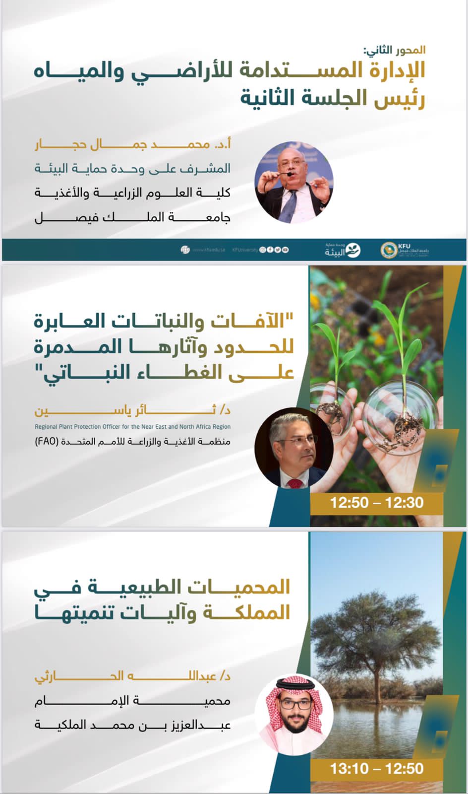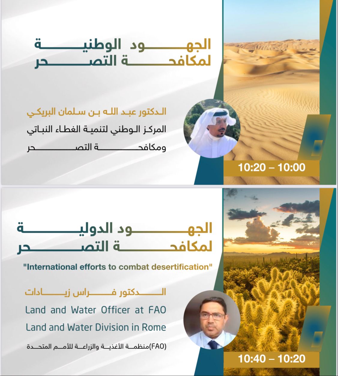 وتشارك الفاو من خلال عرضين، الأول يلقيه الدكتور ثائر ياسين المسؤول الإقليمي لوقاية النبات في مكتب منظمة الفاو في الشرق الأدنى وشمال أفريقيا عن الآفات والنباتات العابرة للحدود وآثارها المدمرة على الغطاء النباتي والثاني يتطرق إلى الجهود الدولية لمكافحة التصحر يقدمه الدكتور فراس زيادات مسؤول قسم الأراضي والمياه في مكتب منظمة الفاو في روما.
