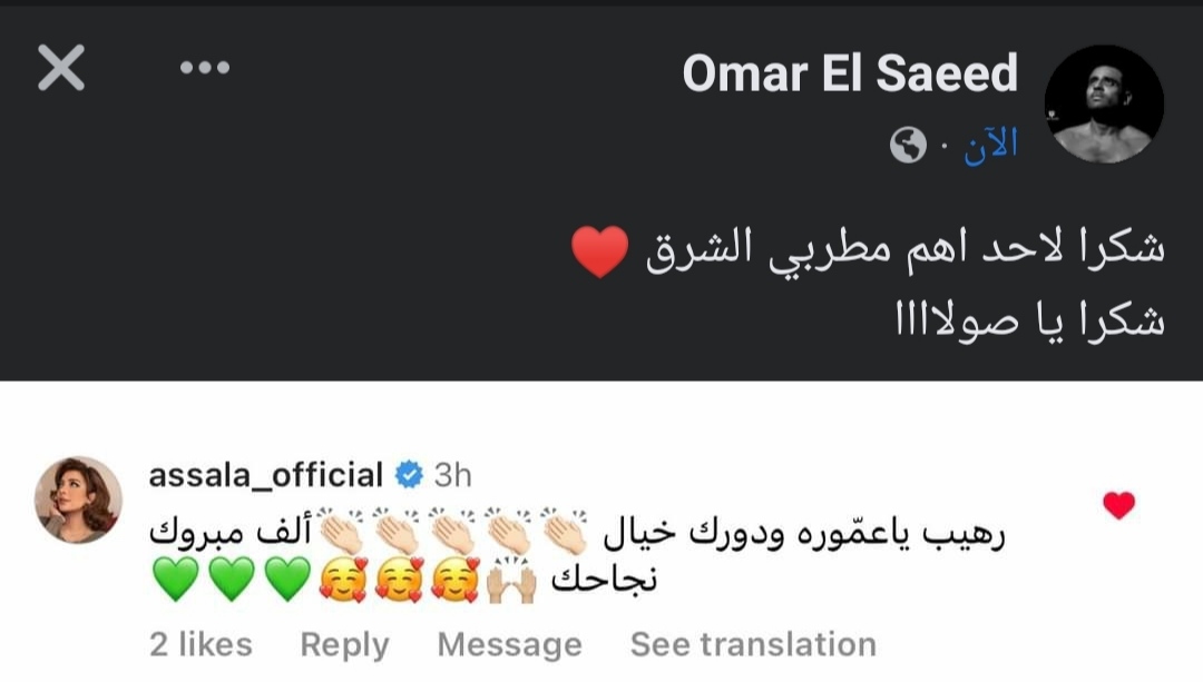 فعلقت أصالة على أحد منشورات السعيد عبر إنستجرام، وكتبت: رهيب يا عمورة ودورك خيال، ألف مبروك نجاحك.