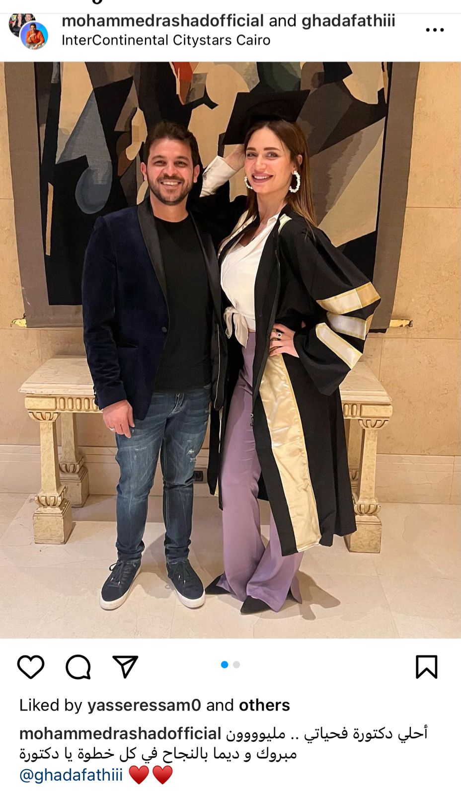 حرص المطرب محمد رشاد على تهنئة خطيبته غادة فتحي بحصولها على الدكتوراه، وذلك عبر حسابه الرسمي بموقع تبادل الصور والفيديوهات انستجرام.