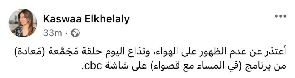 وكتبت الخلالي عبر حسابها الرسمي على فيس بوك: " أعتذر عن عدم الظهور على الهواء، وتذاع اليوم حلقة مُجَمَّعة (مُعادة) من برنامج في المساء مع قصواء) على شاشة cbc".