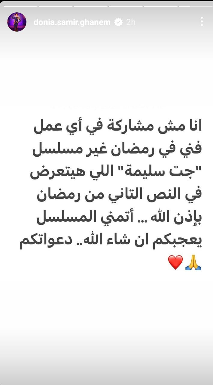 وكتبت دنيا سمير غانم عبر خاصية ستوري بموقع تبادل الصور والفيديوهات انستجرام: “أنا مش مشاركة في أي عمل في رمضان غير مسلسل جت سليمة اللي هيتعرض في النص التاني من رمضان بإذن الله، وأتمنى أنه يعجبكم إن شاء الله”.