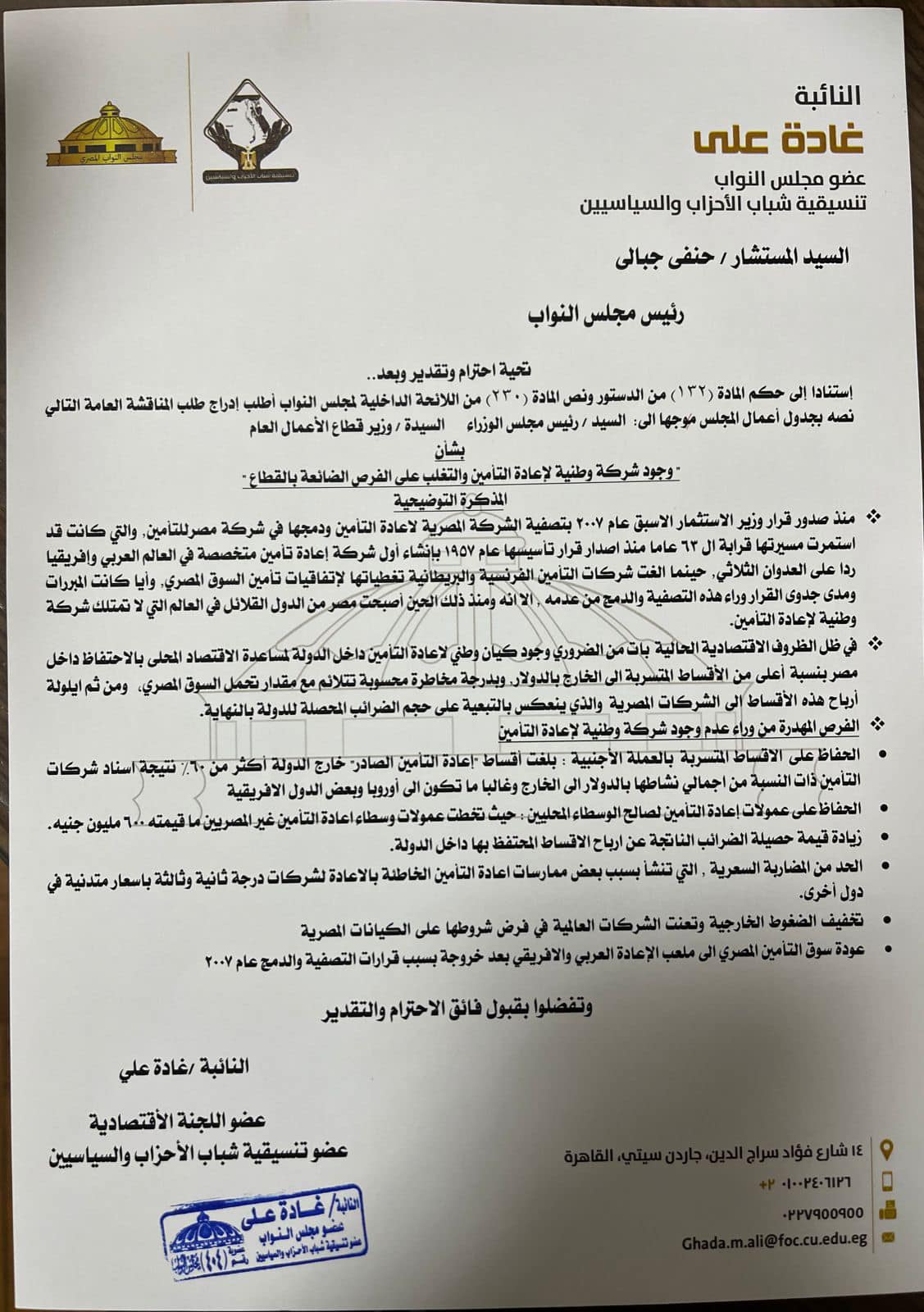 والجدير بالذكر أن النائبة غادة علي، عضو مجلس النواب عن تنسيقية شباب الأحزاب والسياسيين، قد تقدمت مسبقًا بطلب مناقشة عامة للمستشار الدكتور حنفي جبالي، موجه إلي رئيس مجلس الوزراء، وزير قطاع الأعمال العام، بشأن "ضرورة وجود شركة وطنية لإعادة التأمين والتغلب على الفرص الضائعة بالقطاع".