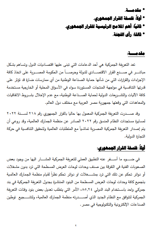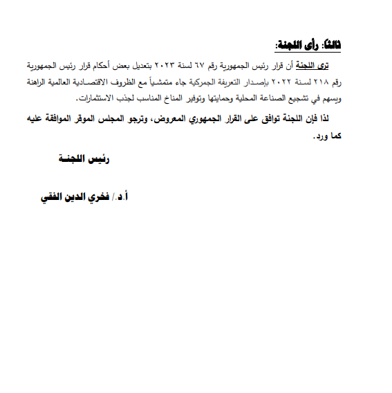وأكد الفقي، أن القرار الجمهوري رقم 67 لسنة 2023 اشتمل بتعديل بعض فئات التعريفة الجمركية على مادتين بخلاف مادة النشر تضمنت أهم أحكامها ما يلي: