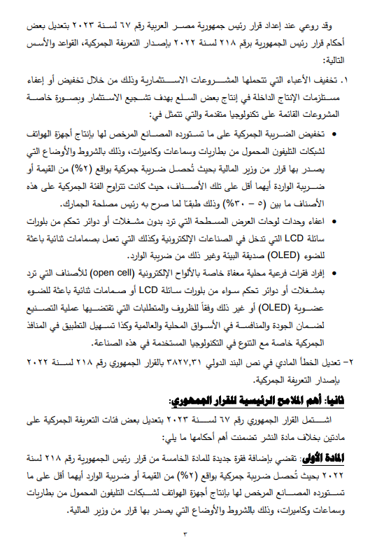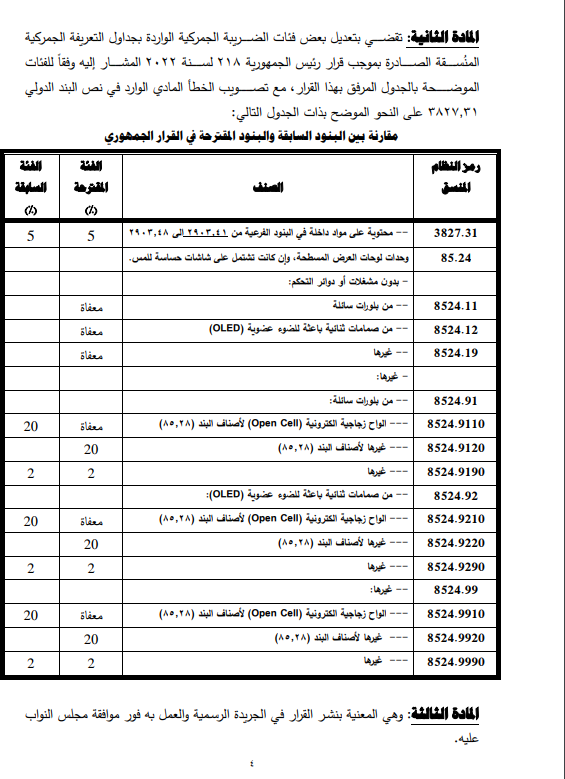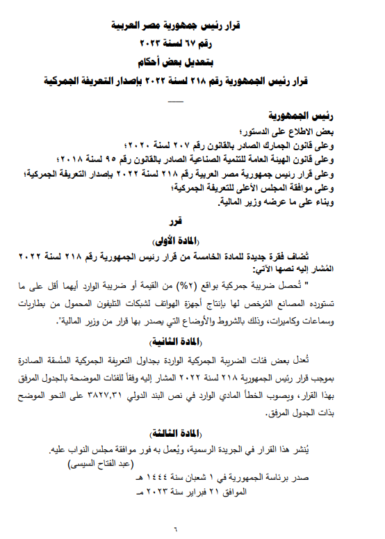 المادة الأولى: تقضي بإضافة فقرة جديدة للمادة الخامسة من قرار رئيس الجمهورية رقم 218 لسنة 2022 بحيث تحصل ضريبة جمركية بواقع (2%) من القيمة أو ضريبة الوارد أيهما أقل على ما تستورده المصانع المرخص لها بإنتاج أجهزة الهواتف لشبكات التليفون المحمول من بطاريات و سماعات و كاميرات، و ذلك بالشروط و الأوضاع التي يصدر بها قرار من وزير المالية.
