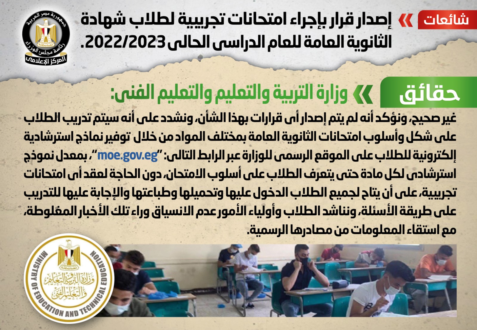 نفي المركز الاعلامي لرئاسة مجلس الوزراء ما تداولته بعض المواقع الإلكترونية وصفحات التواصل الاجتماعي أنباء بشأن إصدار قرار بإجراء امتحانات تجريبية لطلاب شهادة الثانوية العامة للعام الدراسي الحالي 2022/2023، وقد قام المركز الإعلامي لمجلس الوزراء بالتواصل مع وزارة التربية والتعليم والتعليم الفني، والتي نفت تلك الأنباء.