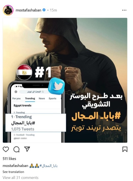ونشر مصطفى شعبان صورة تجمع عدد التغريدات وترقيم اسم بابا المجال برقم 1 على تريندات موقع تويتر، وانهالت التعليقات المهنئة له.