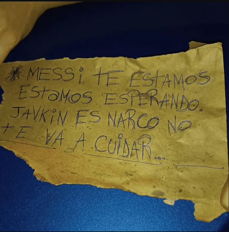 وتحدثت عن الرسالة التي تحتوي على تهديد كُتبت على قطعة من كيس للفحم، وجاء فحواها :" ميسي نحن ننتظرك، جافكين تاجر مخدرات، ولن يقوم بالاعتناء بك جيدًا ".