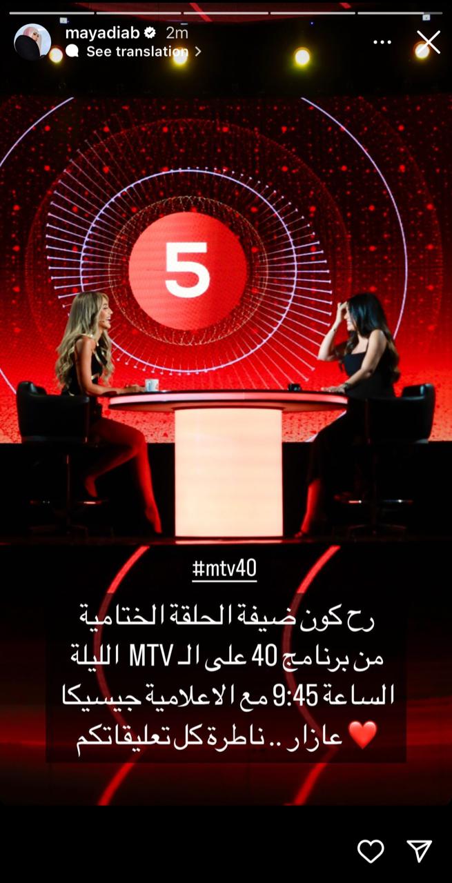 ونشرت مايا دياب صورة من كواليس حضورها في البرنامج عبر خاصية ستوري بانستجرام، معلقة: رح كون ضيفة الحلقة الختامية من برنامج 40 على الـ MTV الليلة.
