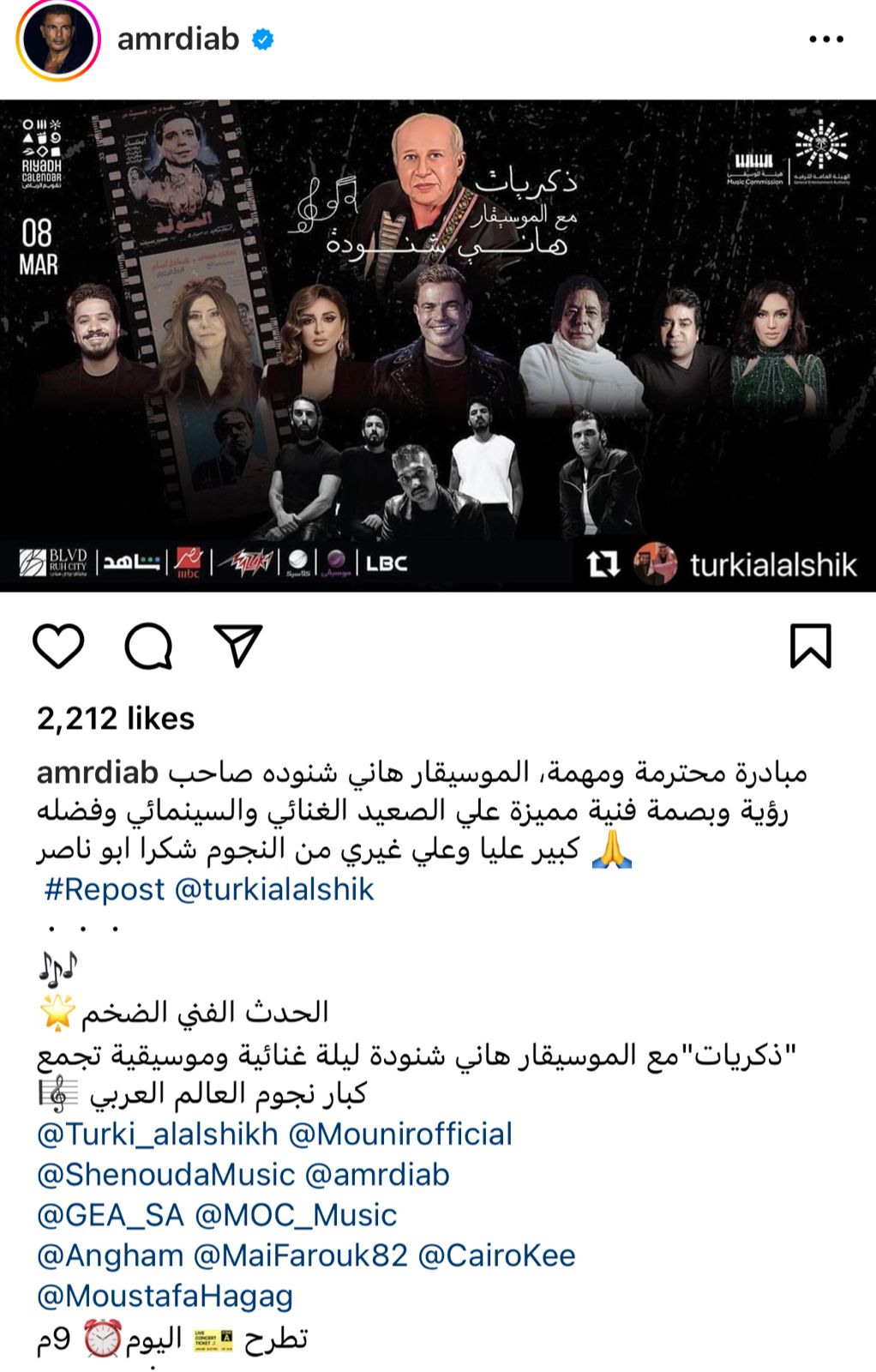 روج عمرو دياب لحفل ذكريات مع الموسيقار هاني شنودة، بحضور عدد كبير من النجوم مثل أنغام، الهضبة، ومصطفى حجاج، وذلك عبر حسابه بانستجرام.