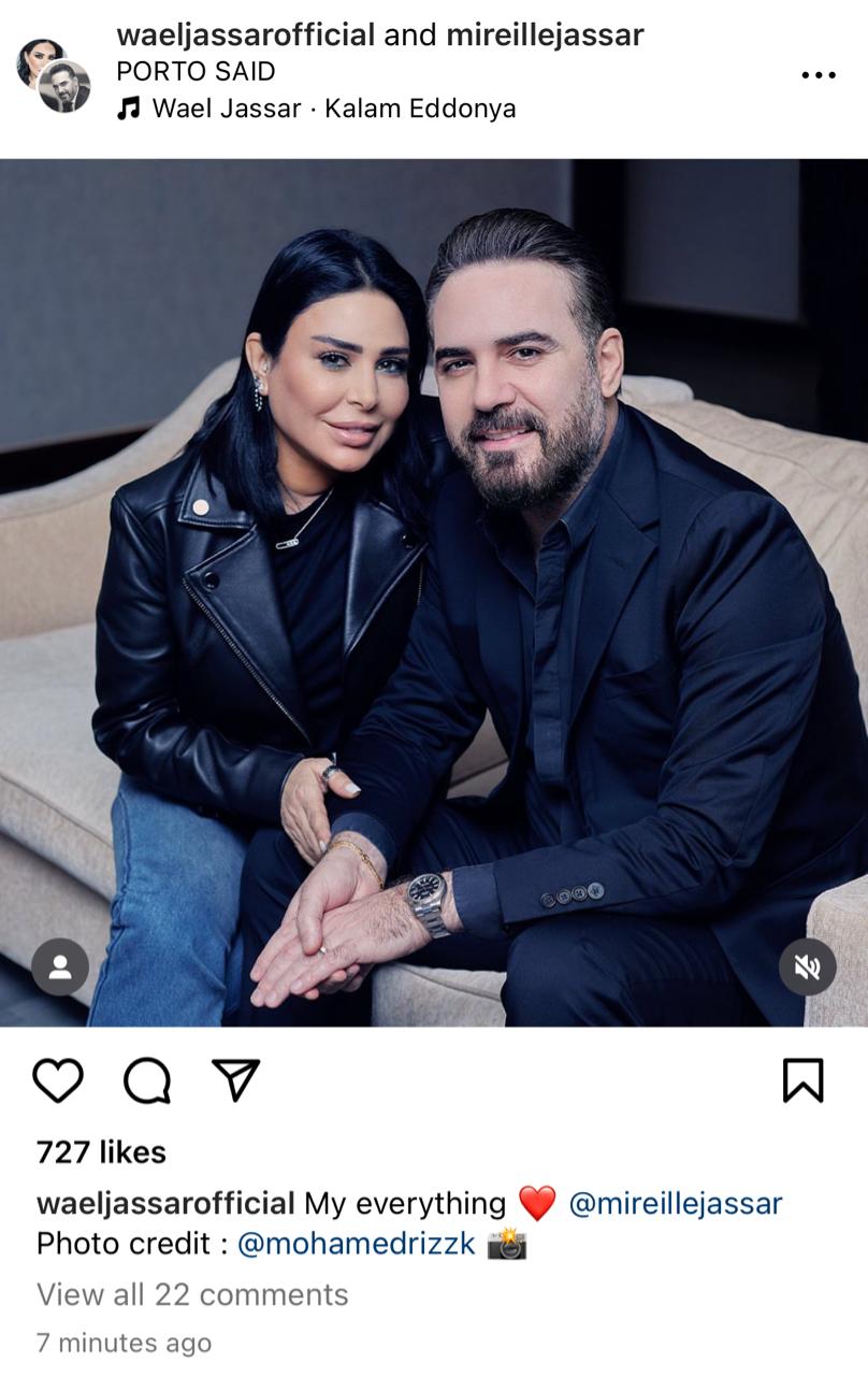 غازل الفنان وائل جسار زوجته عن طريق نشر صورة تجمعه بها، وذلك عبر حسابه الرسمي بموقع تبادل الصور والفيديوهات الشهير انستجرام.