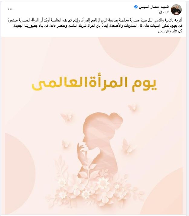 وكتبت السيدة انتصار السيسي على صفحتها على فيس بوك: "أتوجه بالتحية والتقدير لكل سيدة مصرية مخلصة بمناسبة اليوم العالمي للمرأة".