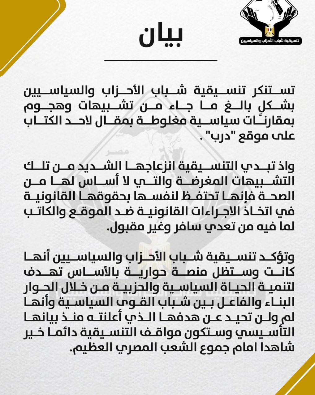 استنكرت تنسيقية شباب الأحزاب والسياسيين بشكلٍ بالغ ما جاء من تشبيهات وهجوم بمقارنات سياسية مغلوطة بمقال لاحد الكتاب على موقع "درب".
