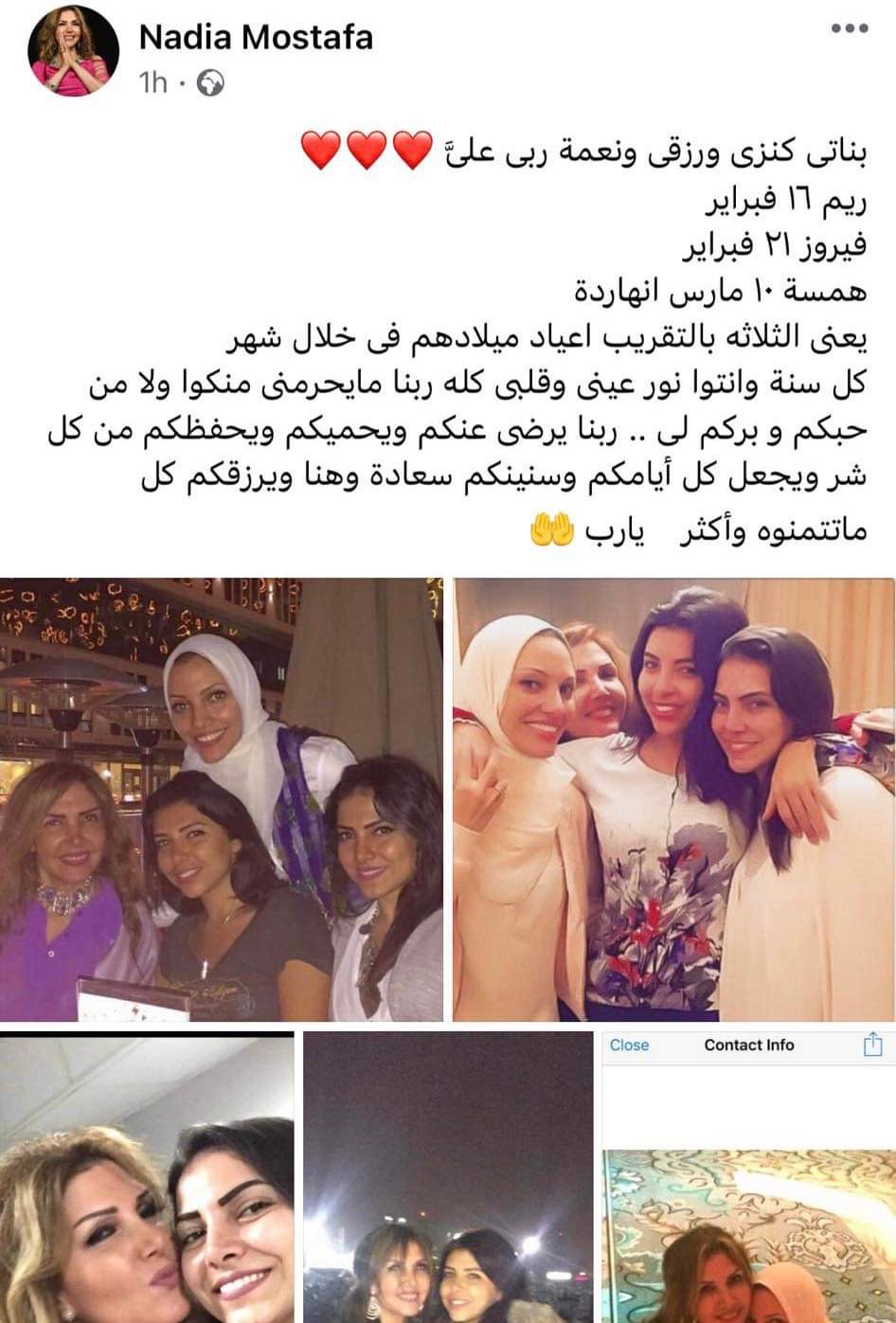 احتفلت المطربة نادية مصطفى صاحبة أغنية الصلح خير بعيد ميلاد بناتها، وذلك عبر حسابها الرسمي بموقع التواصل الاجتماعي الشهير فيسبوك.