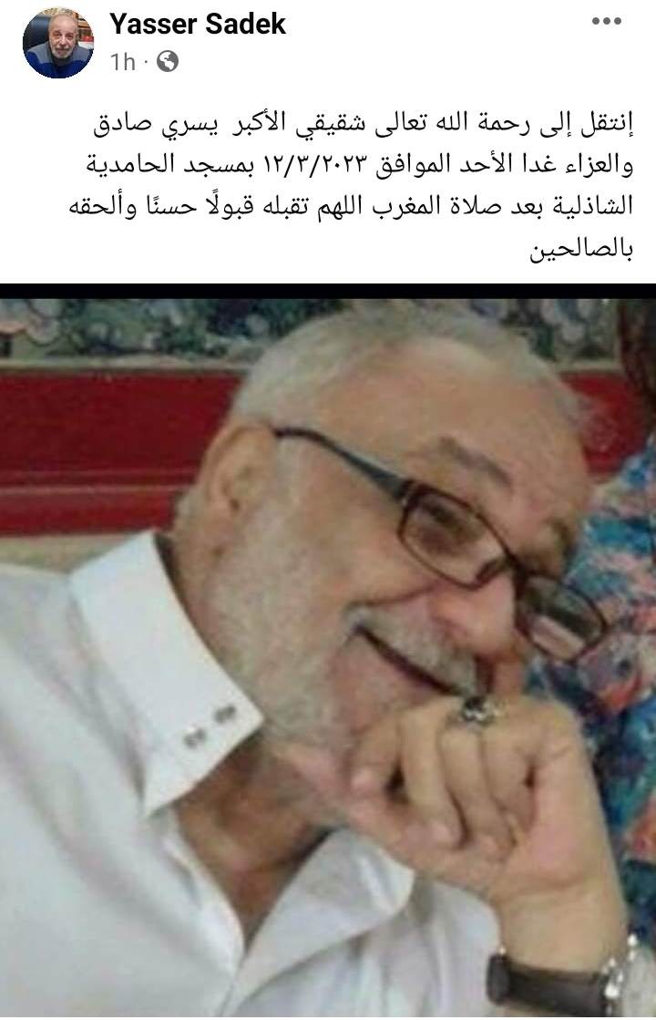 وكتب ياسر صادق معلنا وفاة شقيقه: “انتقل إلى رحمة الله تعالى شقيقي الأكبر يسري صادق والعزاء غدا الأحد الموافق ١٢/٣/٢٠٢٣ بمسجد الحامدية الشاذلية بعد صلاة المغرب اللهم تقبله قبولًا حسنًا وألحقه بالصالحين”.