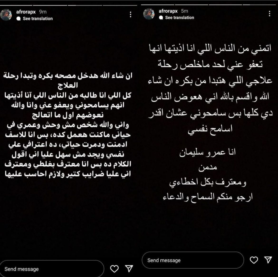 واختتم: اتمنى من الناس اللي انا اذيتها انها تعفو عني لحد ماخلص رحلة علاجي اللي هتبدأ من بكره واقسم بالله هعوض الناس دي كلها بس سامحوني عشان اقدر اسامح نفسي، انا عمرو سليمان مدمن ومعترف بكل اخطائي ارجو منكم السماح والدعاء.