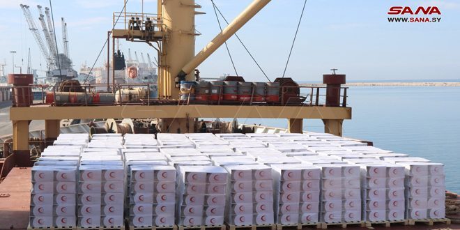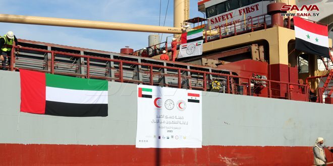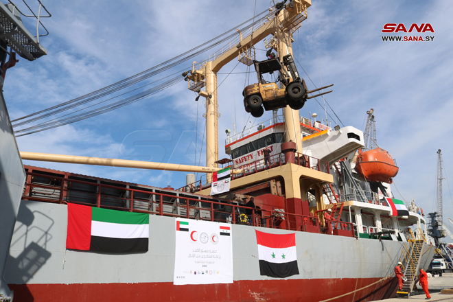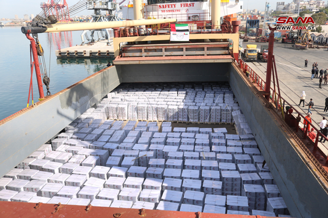 أفادت وكالة "سانا" السورية بوصول ألف طن من المساعدات والمواد الإغاثية إلى مرفأ اللاذقية بسوريا، اليوم الأحد، مقدمة من الهلال الأحمر الإماراتي.