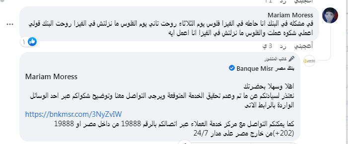 وقالت عميلة بنك مصر في تعليق عبر صفحة المصرف الرسمية على موقع "فيسبوك"، : "في مشكله في البنك أنا حاطة في الفيزا فلوس يوم الثلاثاء روحت تاني يوم الفلوس ما نزلتش في الفيزا روحت البنك قولي اعملي شكوه عملت والفلوس ما نزلتش في الفيزا أنا أعمل إيه".