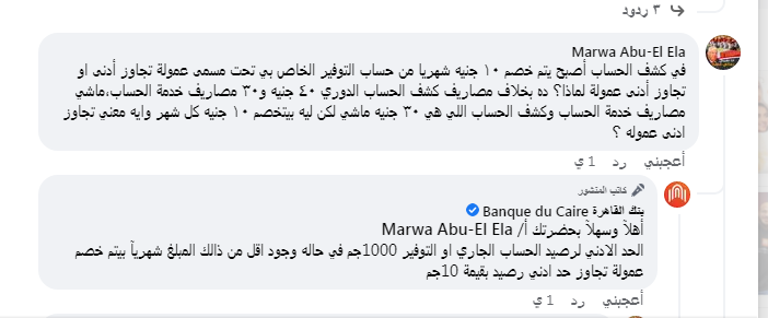 تساءلت أحدى عملاء بنك القاهرة عن الخدمات المقدمة، قائلة: "في كشف الحساب أصبح يتم خصم ١٠ جنيه شهريا من حساب التوفير الخاص بي تحت مسمى عمولة تجاوز أدنى او تجاوز أدنى عمولة لماذا؟ ده بخلاف مصاريف كشف الحساب الدوري ٤٠ جنيه و٣٠ مصاريف خدمة الحساب".