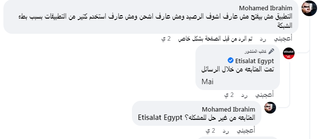 وقال أحد عملاء اتصالات مصر في تعليق عبر صفحة الشركة الرسمية على موقع "فيسبوك"،: "التطبيق مش بيفتح مش عارف أشوف الرصيد ومش عارف اشحن ومش عارف استخدم كتير من التطبيقات بسبب بطء الشبكة".