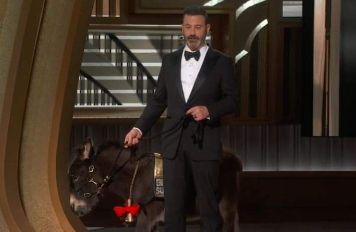 ظهر جيمي كيميل على مسرح حفل توزيع جوائز الأوسكار 2023 رفقة الحمار “جيني”، وهو بطل أحد الأعمال الفنية التي كانت ضمن جوائز الأوسكار هذا العام، وبمجرد ظهور جيمي كيميل مع الحمار على المسرح تفاعل معه الحاضرين ودخلوا في هيسترية ضحك شديدة.