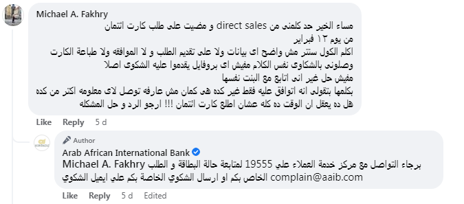 قال أحد عملاء البنك العربى الافريقى في تعليق عبر صفحة المصرف الرسمية على موقع "فيسبوك"،: "حد كلمنى من direct sales ومضيت على طلب كارت ائتمان من يوم ١٢ فبراير".
