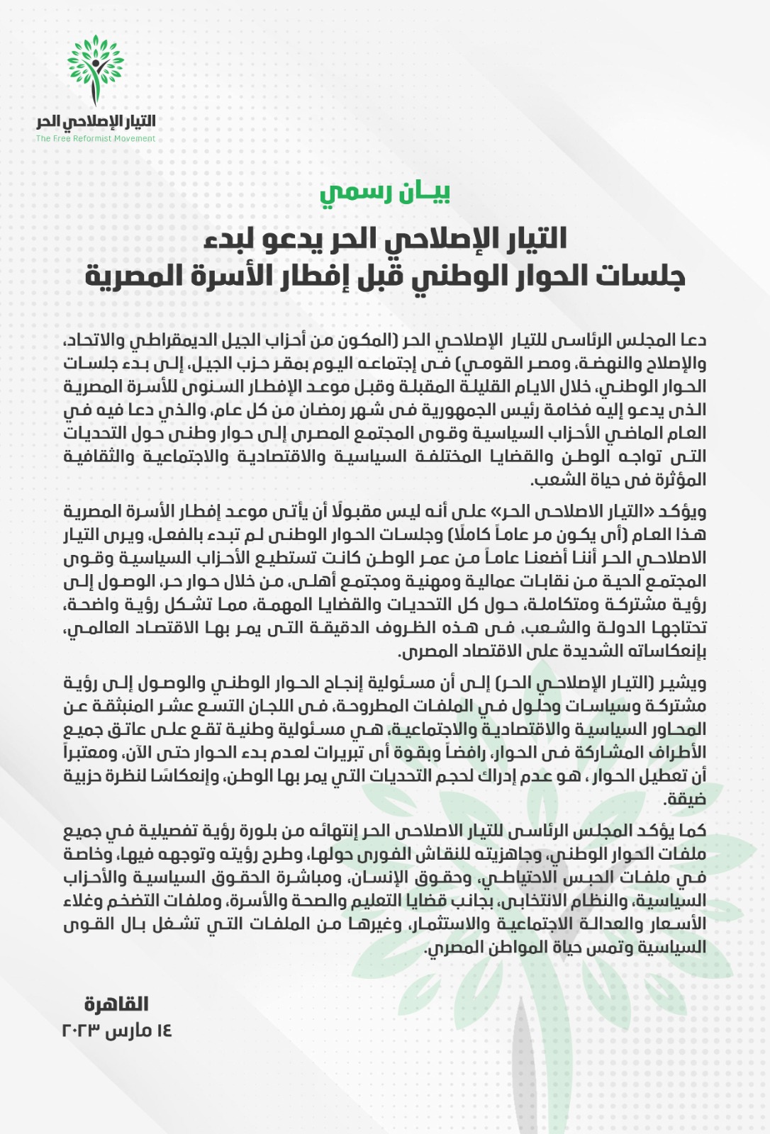 ودعا فيه الأحزاب السياسية وقوى المجتمع المصرى إلى حوار وطنى حول التحديات التى تواجه الوطن والقضايا المختلفة السياسية والاقتصادية والاجتماعية والثقافية المؤثرة فى حياة الشعب، مشدداً «التيار الاصلاحى الحر» على أنه ليس مقبولاً أن يأتى موعد إفطار الأسرة المصرية هذا العام (أى يكون مر عاماً كاملاً) وجلسات الحوار الوطنى لم تبدء بالفعل ، موضحاً كفى أننا أضعنا عاماً من عمر الوطن كانت تستطيع الأحزاب السياسية وقوى المجتمع الحية من نقابات عمالية ومهنية ومجتمع أهلى من خلال حوار حر الوصول إلى رؤية مشتركة و متكاملة حول كل التحديات والقضايا المهمة مما تشكل رؤية واضحة تحتاجها الدولة والشعب فى هذه الظروف الدقيقة التى يمر بها الاقتصاد العالمي بإنعكاساته الشديدة على الاقتصاد المصرى.