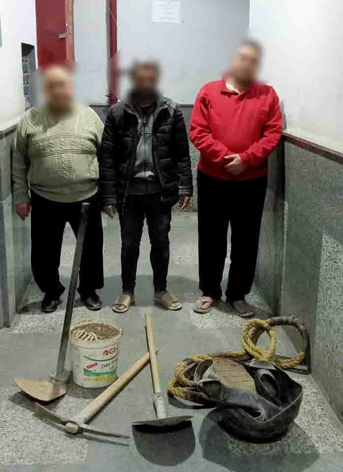 عقب تقنين الإجراءات تم إستهداف العقار المشار إليه وتم ضبط (3 أشخاص – مقيمين بالقاهرة) حال قيامهم بالتنقيب عن الآثار داخل شقة بالطابق الأرضى وعُثر بداخلها على (حفرة بعمق 2 متر) وبحوزتهم الأدوات المستخدمة فى أعمال الحفر.