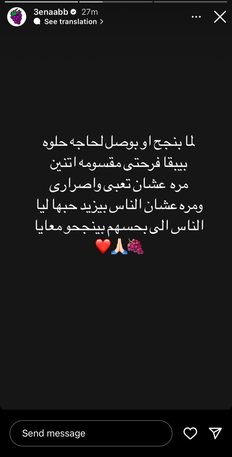 وكتب عنبة عبر انستجرام: لما بنجح او بوصل لحاجة حلوة بيبقى فرحتي مقسومة اتنين مرة عشان تعبي واصراري، ومرة عشان الناس بيزيد حبها ليا.