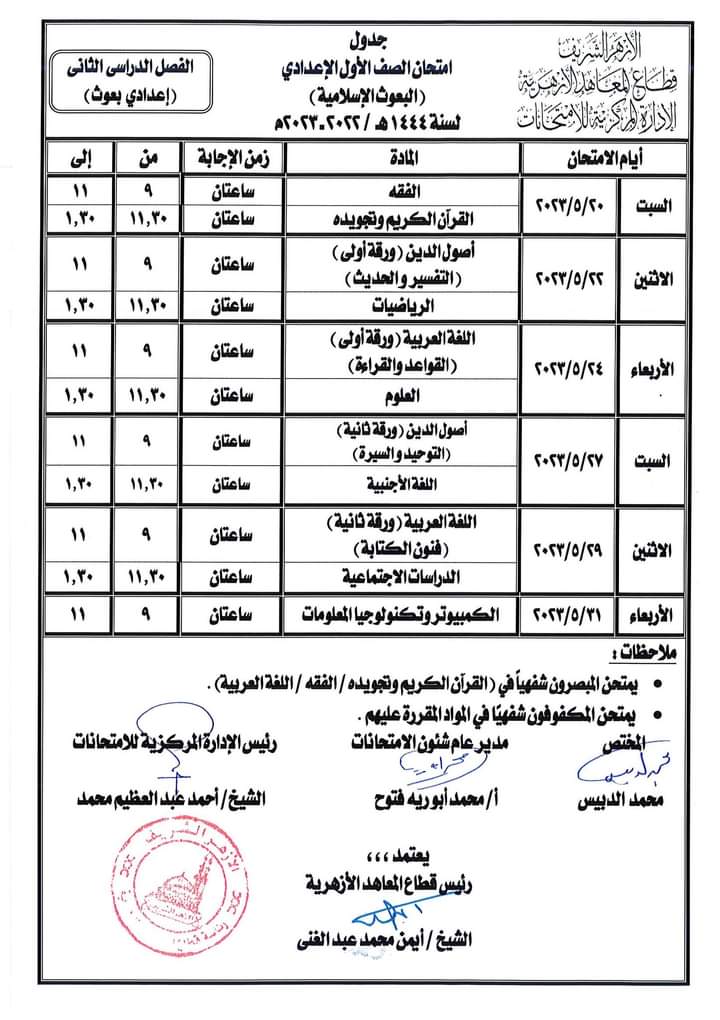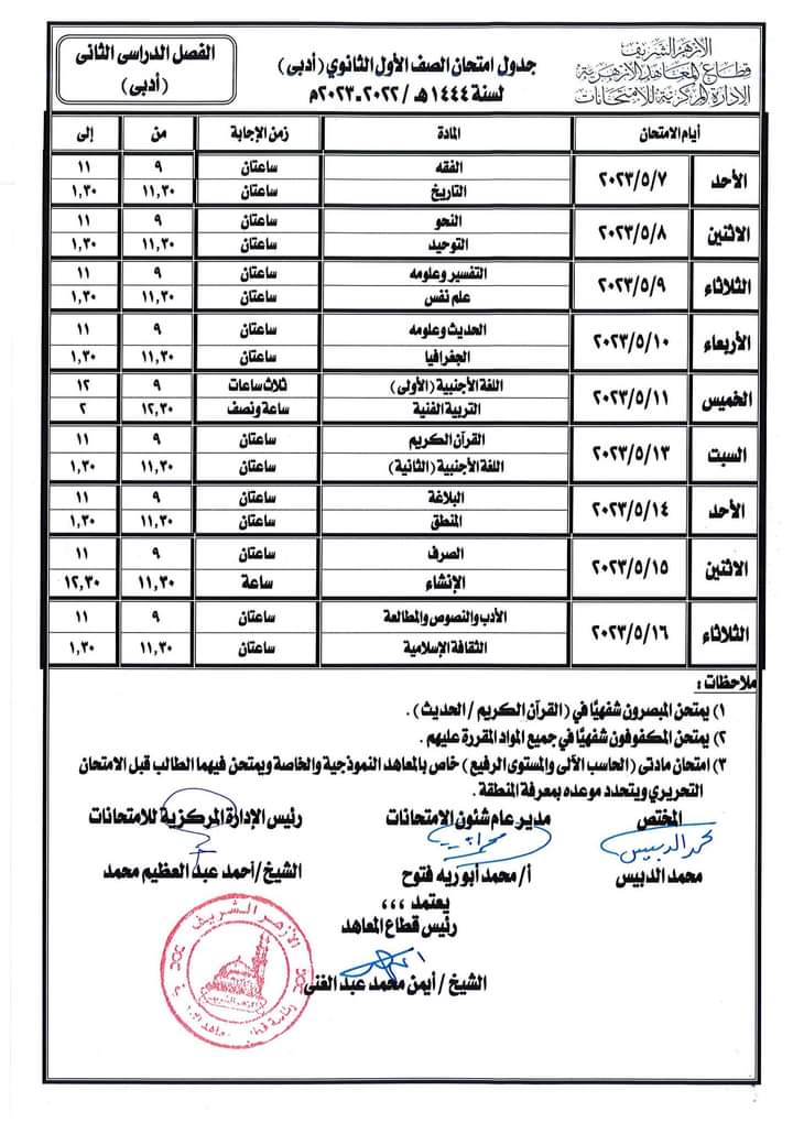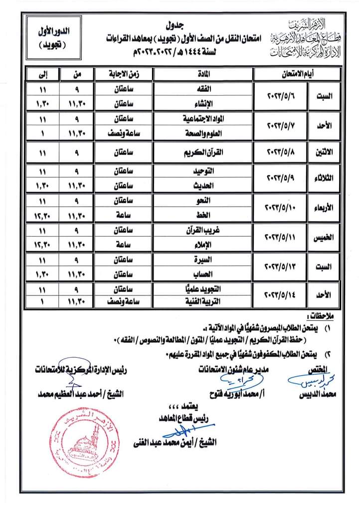 جداول امتحانات الفصل الدراسي الثاني لصفوف النقل بالمعاهد الأزهرية