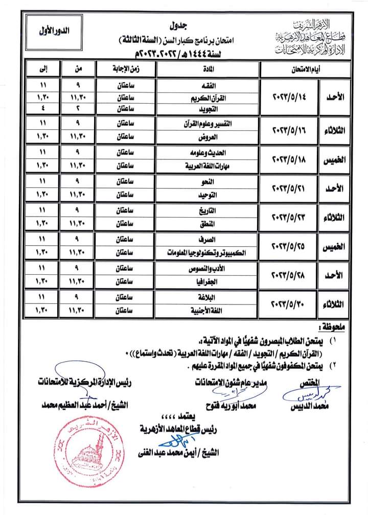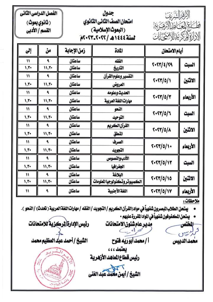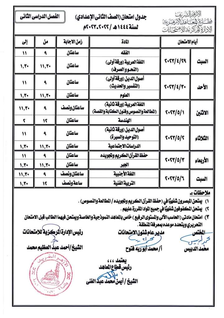 ومن المقرر أن تبدأ امتحانات الفصل الدراسي الثاني بقطاع المعاهد الأزهرية، عقب إجازة عيد الفطر المبارك، في ال٢٩ من أبريل المقبل.