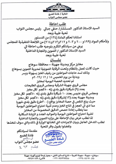 طلب إحاطة للنائبة غادة الضبع بشأن مخابز مركز ومدينة جهينة بمحافظة سوهاج