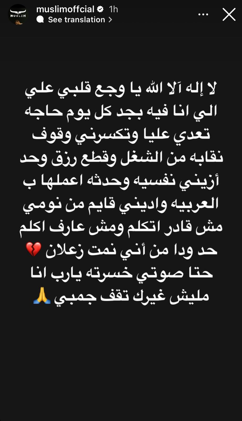وكتب مسلم في خاصية الاستوري عبر حسابه بموقع تبادل الصور والفيديوهات انستجرام: يا وجع قلبي على اللي أنا فيه، بجد كل يوم حاجة تعدي عليا وتكسرني.. وقوف النقابة من الشغل وقطع رزق وحد أذاني نفسيا، وحادثة أعملها بـ العربية.