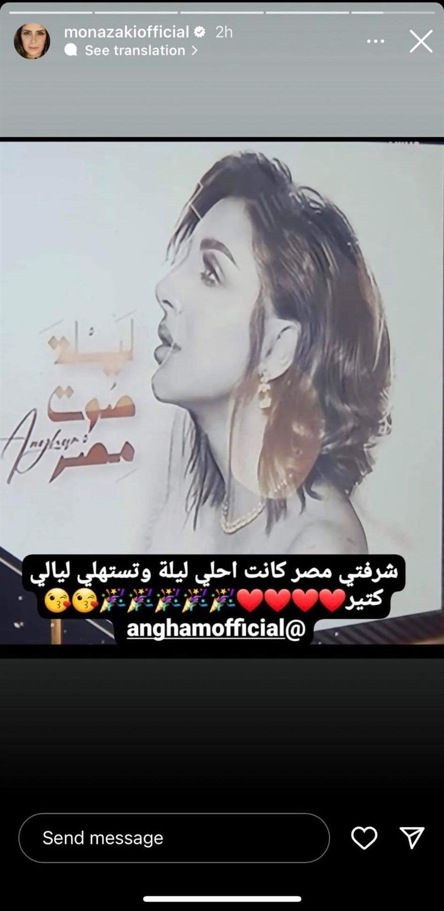 ونشرت منى زكي صورة للفنانة أنغام عبر خاصية ستوري بانستجرام، معلقة: شرفتي مصر وكانت أحلى ليلة وتستاهلي ليالي كتير.