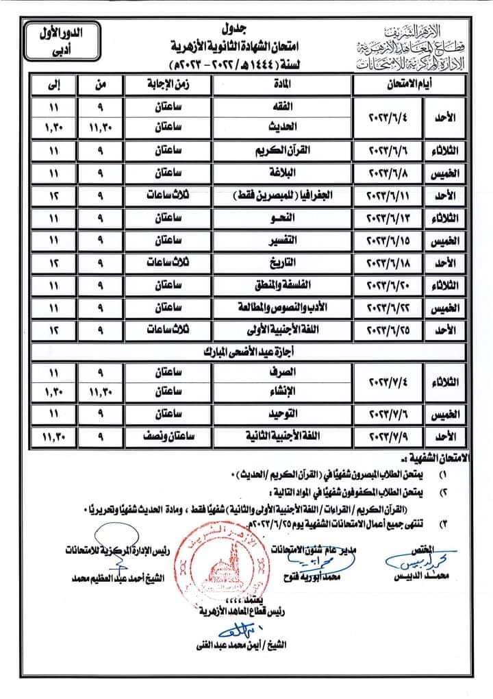 ننشر جدول امتحانات الثانوية الأزهرية 2023 للقسمين الأدبي والعلمي